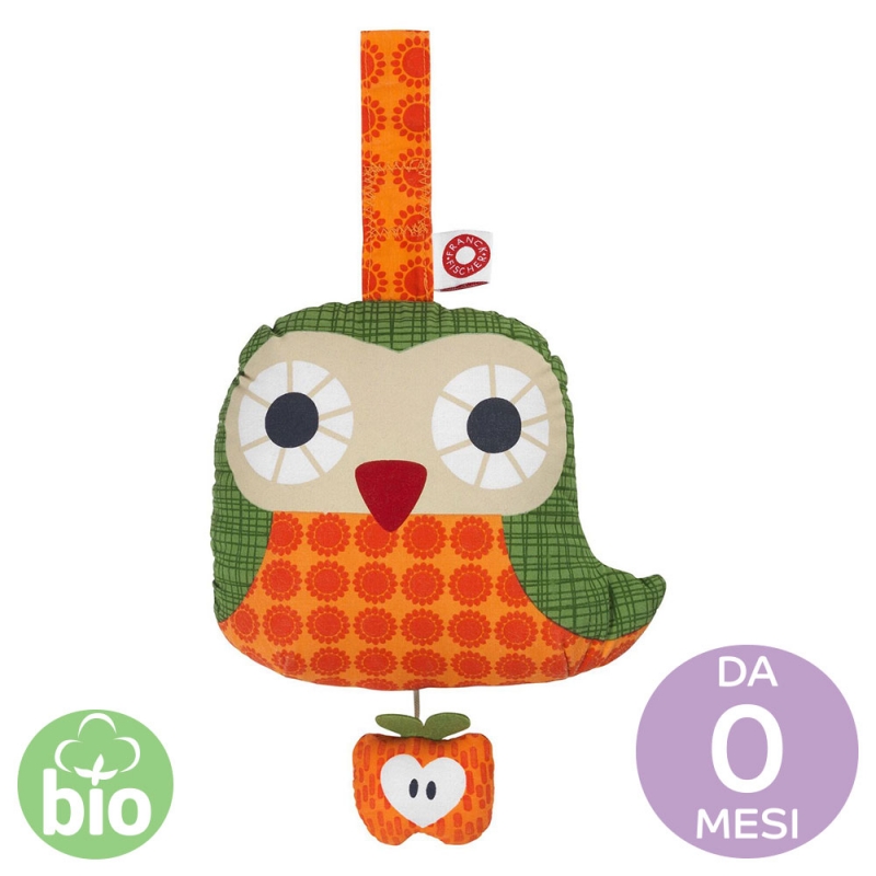 Un gufo gioioso e simpatico in cotone organico, che diventa un melodioso carillon tirando la piccola mela sul quale è posato.