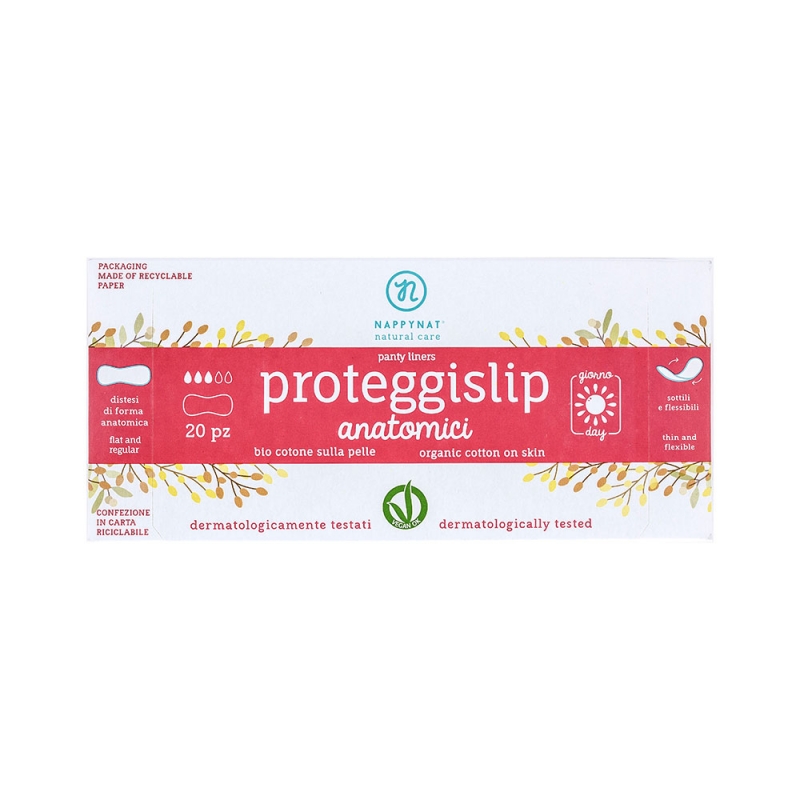 20 salvaslip anatomici stesi Nappynat, in puro cotone biologico.