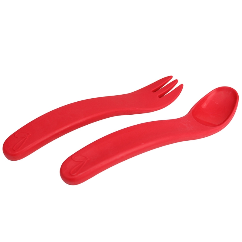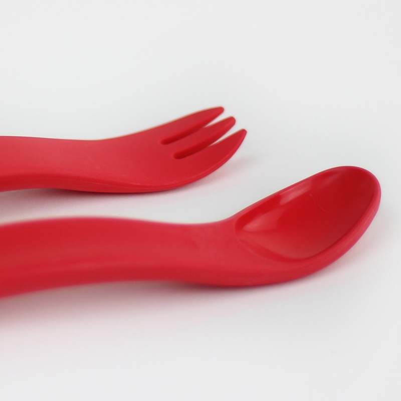 La curvatura del manico della forchetta e del cucchiaio ne facilita la presa, mentre l'angolatura della sommità aiuta a mangiare da soli. Infine, la punta del cucchiaio elevata evita che il cibo cada sul tavolo.