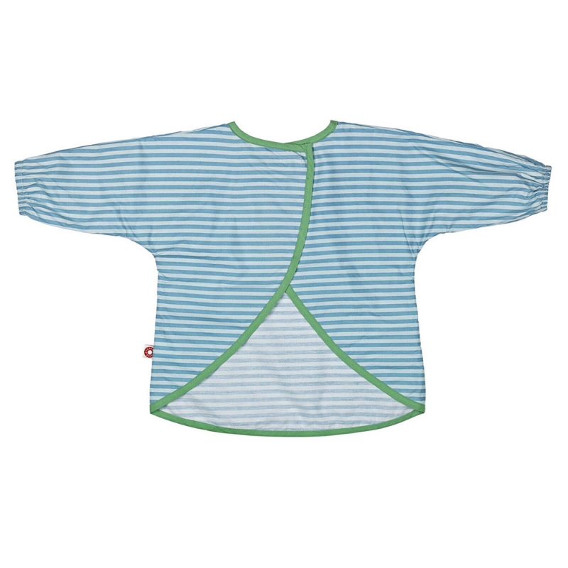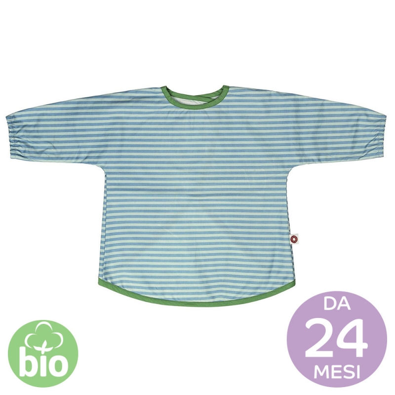 Comodo e pratico grembiule e bavaglino con maniche, con chiusura in velcro, realizzato in cotone biologico certificato, con un sottile strato di verniciatura acrilica per facilitarne la manutenzione, privo di ftalati. Ideale a tavola così come per il gioco, per proteggere i vestiti da cibo, pittura, pongo, ecc. La fantasia è stampata con tinte ecologiche.