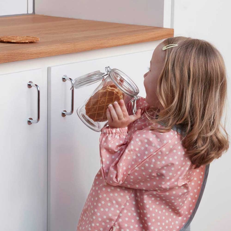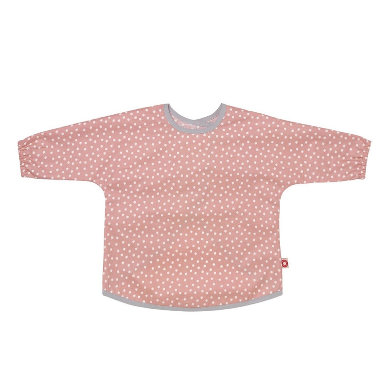 Comodo e pratico grembiule e bavaglino con maniche, con chiusura in velcro, realizzato in cotone biologico certificato, con un sottile strato di verniciatura acrilica per facilitarne la manutenzione, privo di ftalati. Ideale a tavola così come per il gioco, per proteggere i vestiti da cibo, pittura, pongo, ecc. La fantasia è stampata con tinte ecologiche.
