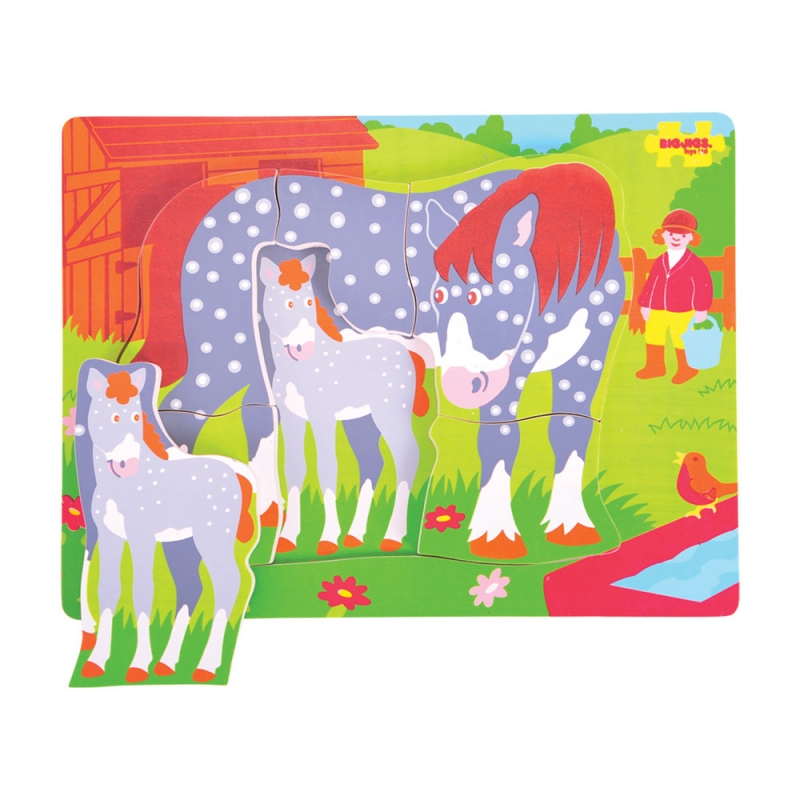 Puzzle realizzato in legno da risorse responsabili. I pezzi sono molto grossi e spessi, facilitando la loro presa anche per le manine dei più piccoli, che possono maneggiarli e guardarli senza fatica. La bella immagine della giumenta con il suo puledro, rende il gioco ancora più interessante e stimolante. La stessa immagine è riprodotta anche sotto al puzzle, per aiutare nel coordinamento e nel riconoscere i vari elementi grafici.