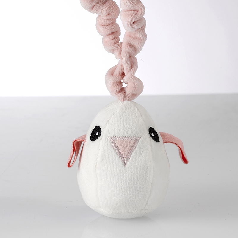 Ha una fascia elastica con un bottone automatico per poter essere appeso a qualsiasi culla, mobile, carrozzina, passeggino, seggiolino o seggiolone. Quando lo scuoti, fa un dolce cinguettio!