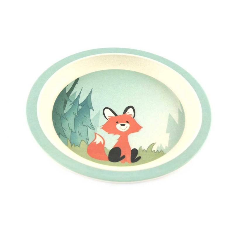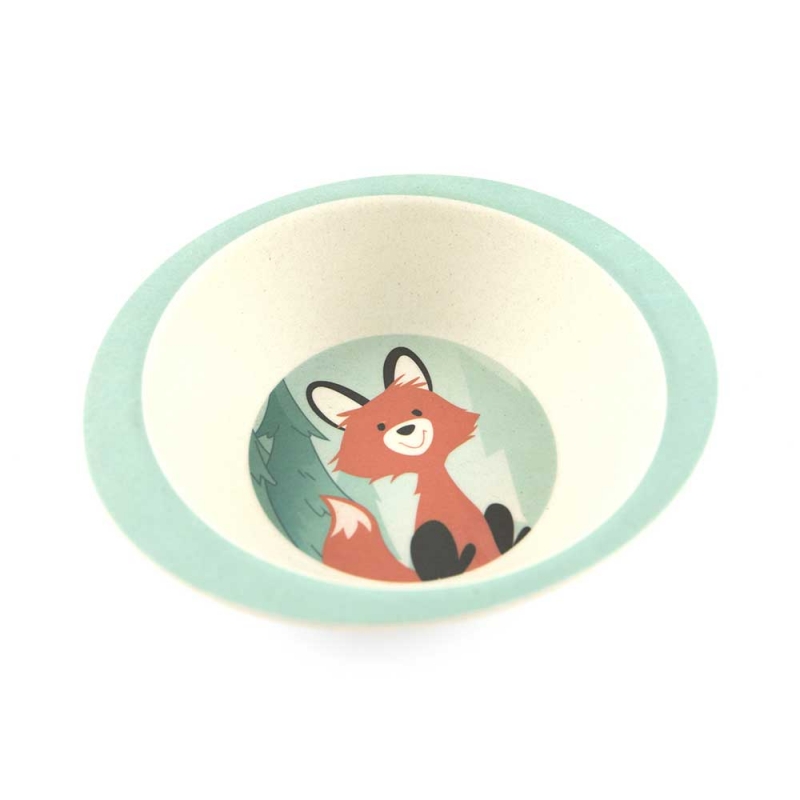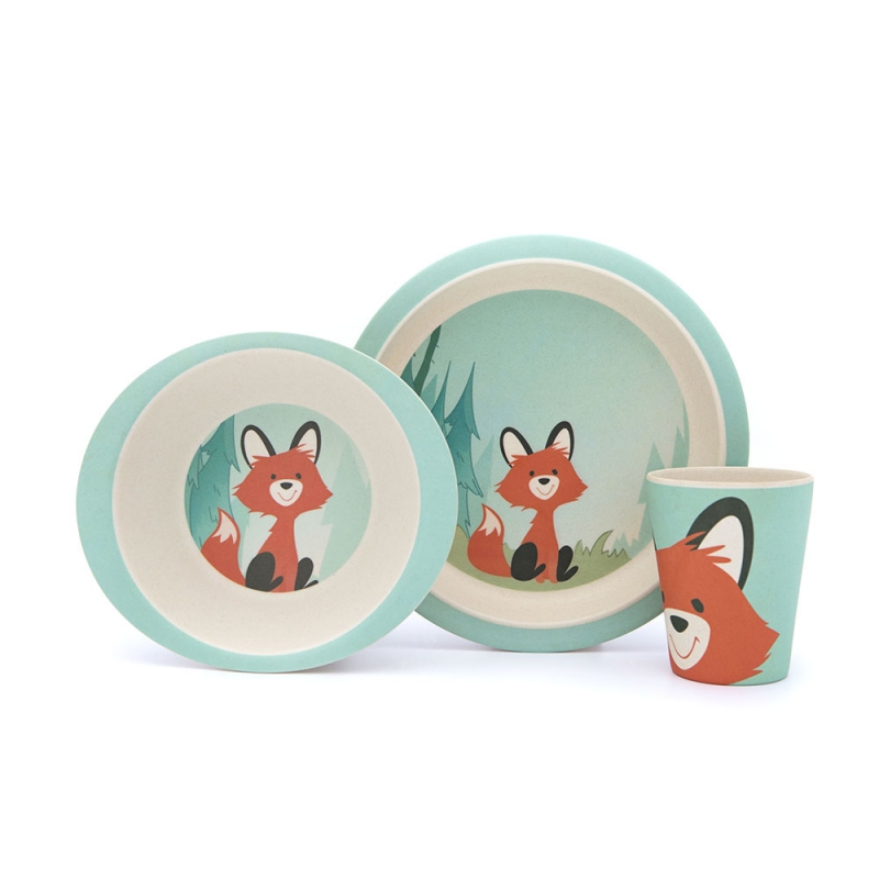 Set da tavola realizzato in bambù, prodotto naturale ed ecosostenibile, resistente e facile da lavare, anche in lavastoviglie. Il set comprende un piatto, una scodella e un bicchiere ed è finemente decorato con una simpatica volpe nel bosco.