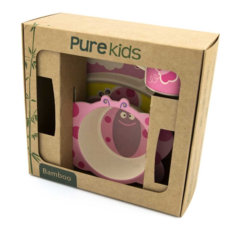 Set bicchiere, piatto e scodella in bambù, Pure Kids, fantasia farfalla.